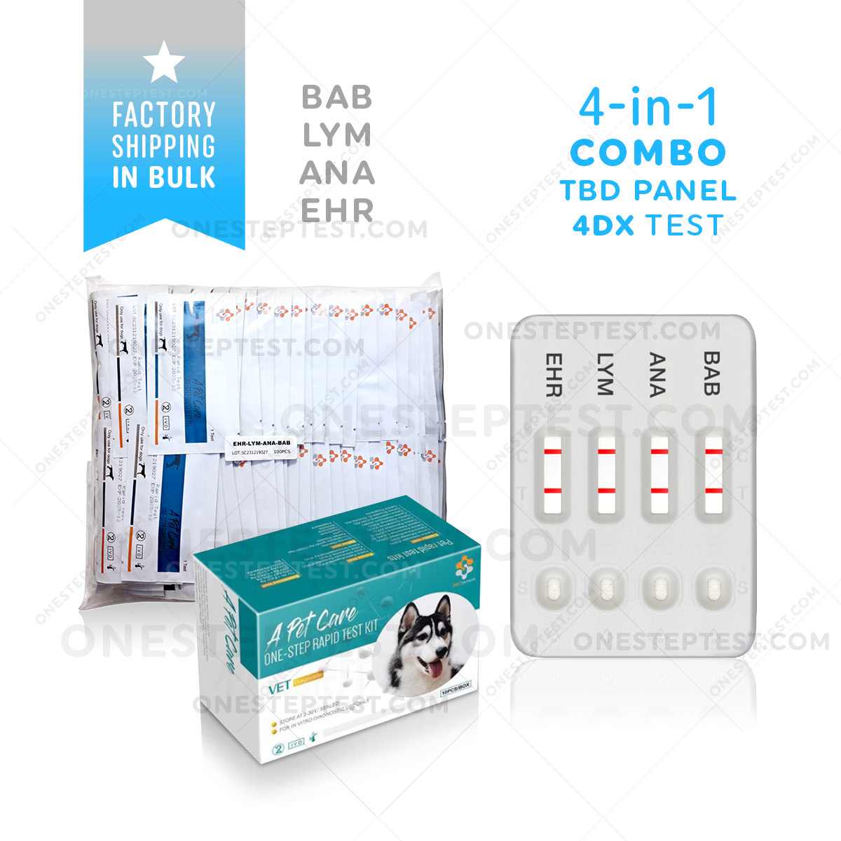 Low cost TBD-4 (Lyme, Ehrlichia, Anaplasma, Babesia) 4-way panel tests sale for dogs and puppies with factory direct door-to-door shipping.