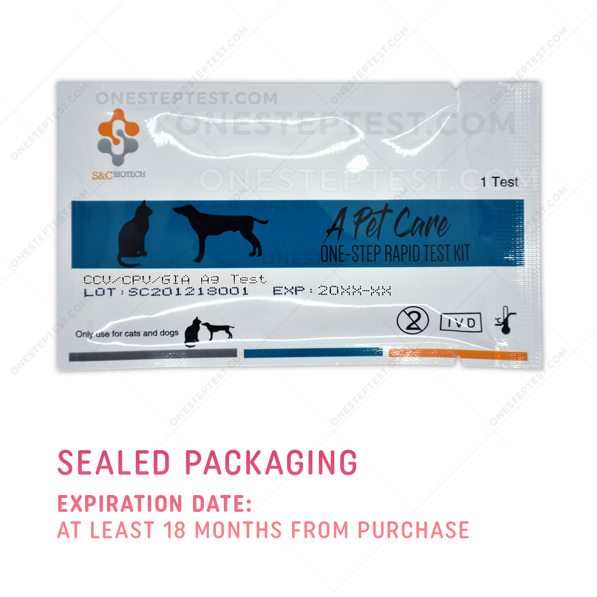 A-PET-CARE One Step CPV+CCV+GIA test for dogs includes one cassette with 3 testing strips (CPV + CCV + GIA).